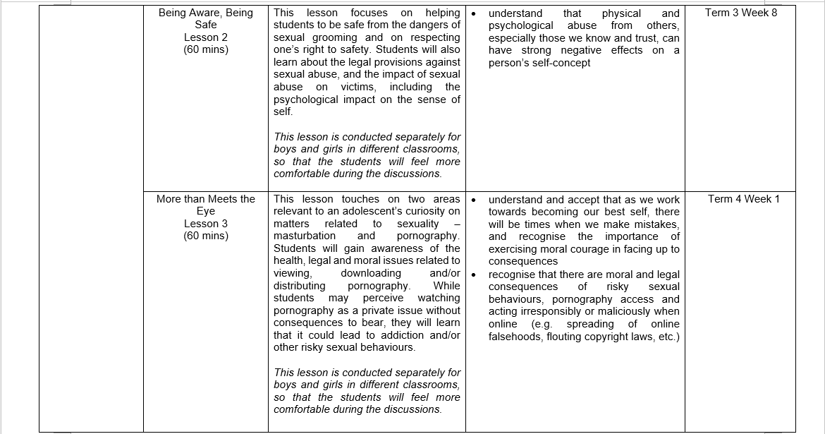 At Yusof Ishak Secondary School, the following Sexuality Education lessons will be taught in 2026: